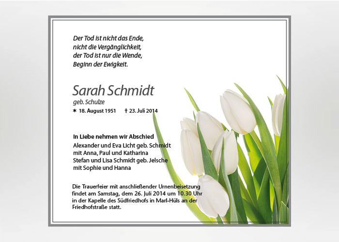 | Beschreibung | Trauermotiv mit Tulpen |