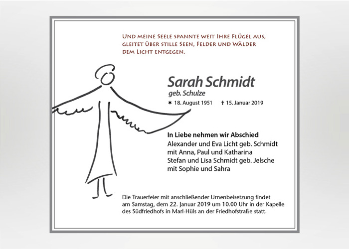 Für Ihre Bestellung oder ein unverbindliches Angebot erreichen Sie mich auch per E-Mail an info@den-tod-anzeigen.de oder Direktkontakt 0177 6868848