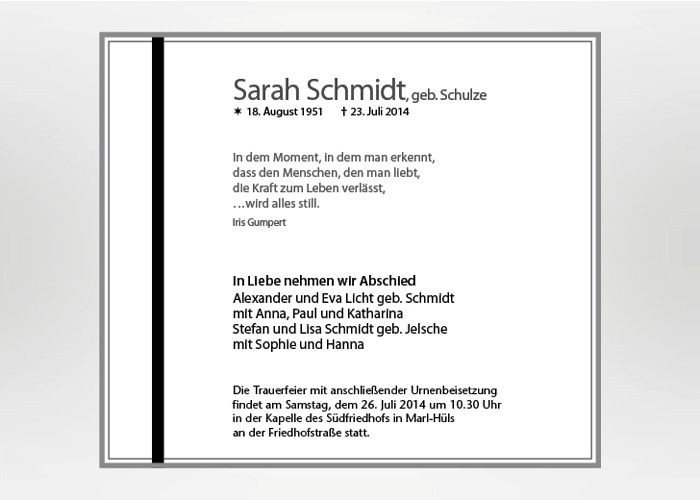Für Ihre Bestellung oder ein unverbindliches Angebot erreichen Sie mich auch per E-Mail an info@den-tod-anzeigen.de oder Direktkontakt 0177 6868848