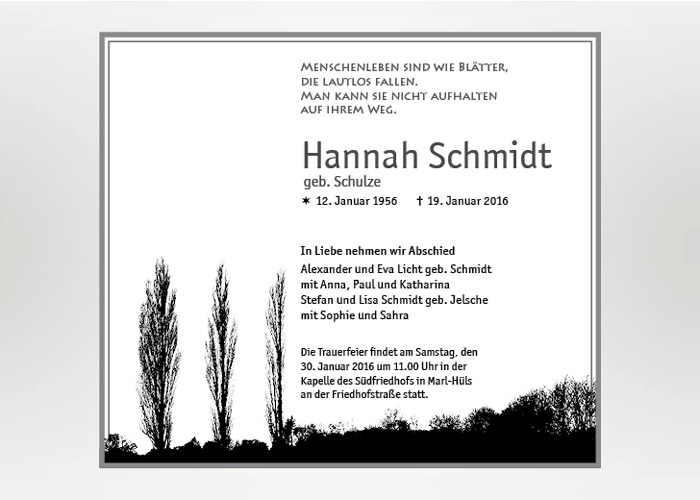 Wir gestalten gerne für Sie eine passende Karte oder Anzeige nach ihren Vorstellungen und Wünschen. Besuchen Sie unsere weiteren Seiten für Traueranzeigen und Trauerkarten mit einer Vielzahl von Motiven.