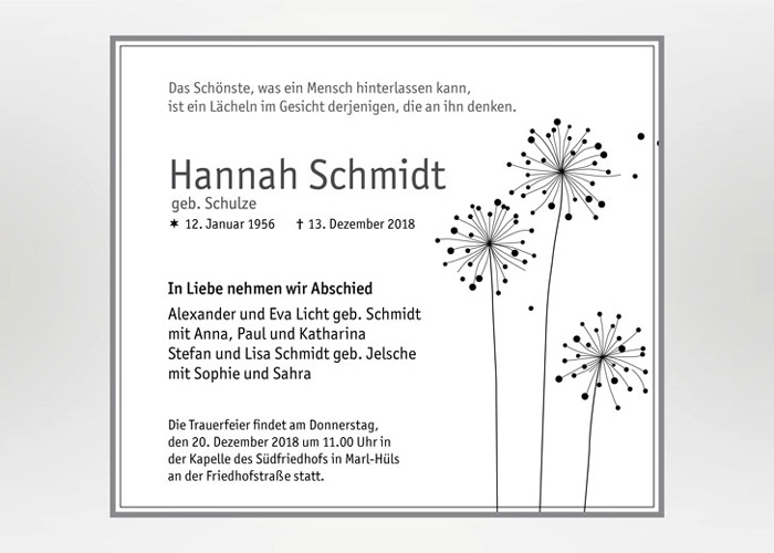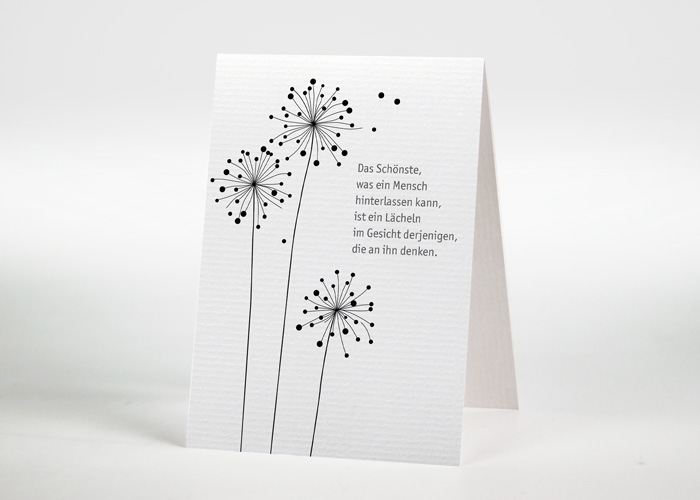 | Beschreibung | Trauermotiv mit Pusteblume und fliegenden Samenkörnern |