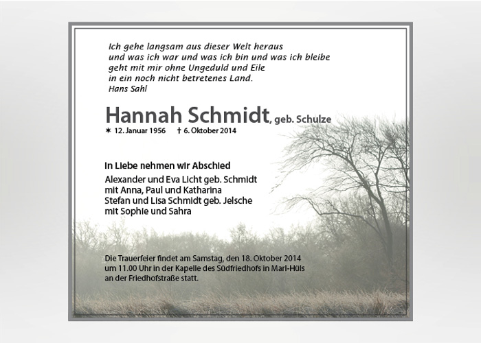Wir gestalten gerne für Sie eine passende Karte oder Anzeige nach ihren Vorstellungen und Wünschen. Besuchen Sie unsere weiteren Seiten für Traueranzeigen und Trauerkarten mit einer Vielzahl von Motiven.