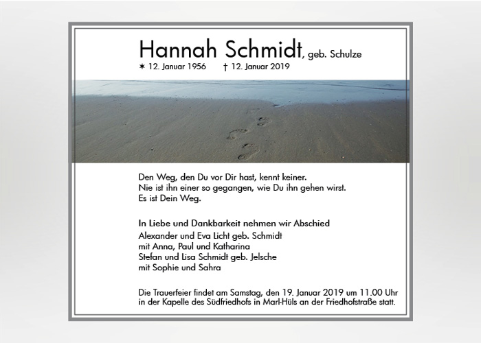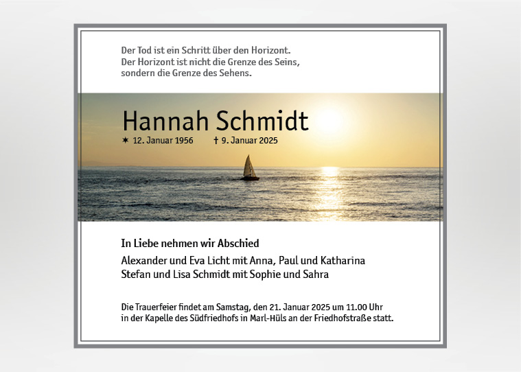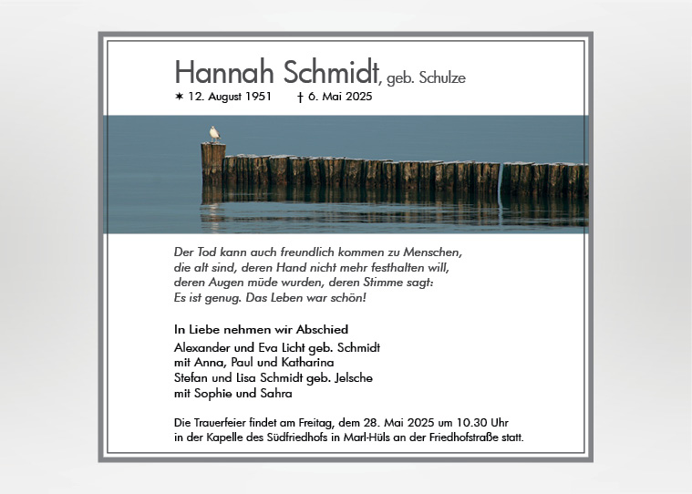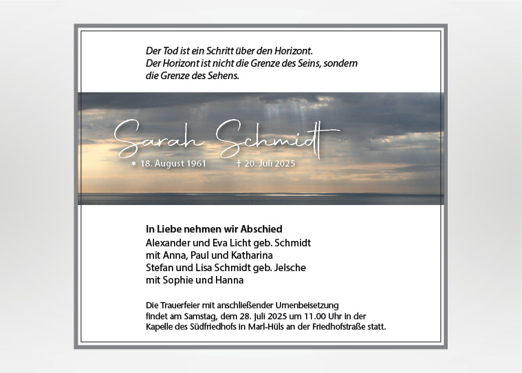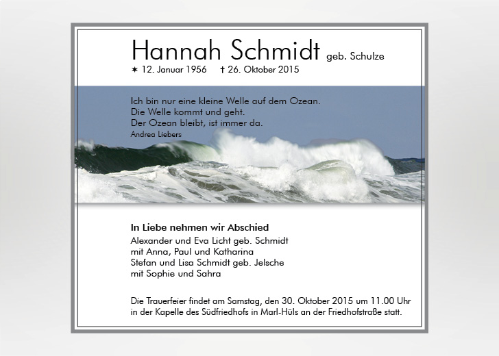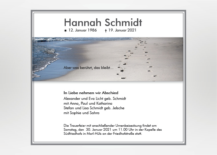 Wir gestalten gerne für Sie eine passende Karte oder Anzeige nach ihren Vorstellungen und Wünschen. Besuchen Sie unsere weiteren Seiten für Traueranzeigen und Trauerkarten mit einer Vielzahl von Motiven.
