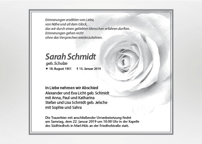 Wir gestalten gerne für Sie eine passende Karte oder Anzeige nach ihren Vorstellungen und Wünschen. Besuchen Sie unsere weiteren Seiten für Traueranzeigen und Trauerkarten mit einer Vielzahl von Motiven.